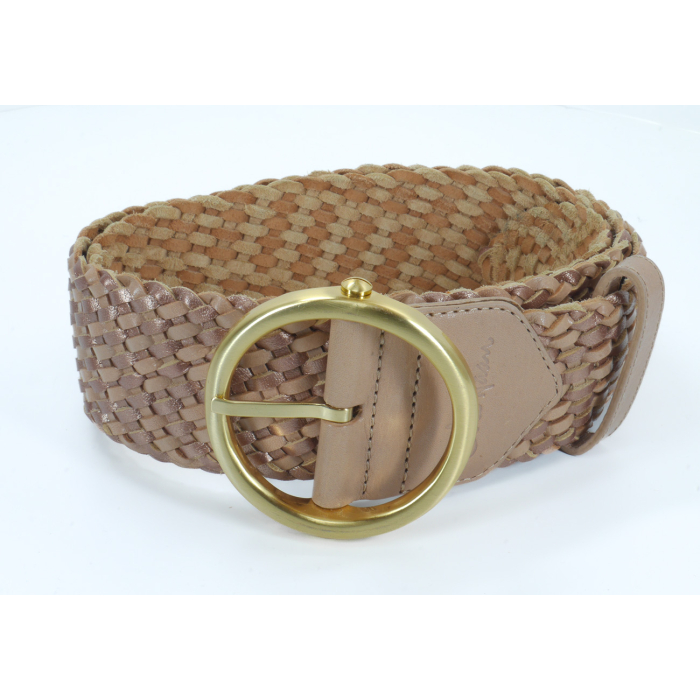 Contructed of two tone braded leather, its around 110 cm long, 5cm wide with a 7.5cm diameter buckle.