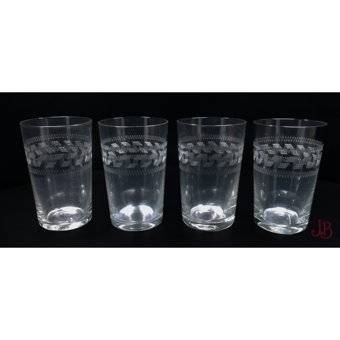 A set of four glasses with an engraved geometric design.